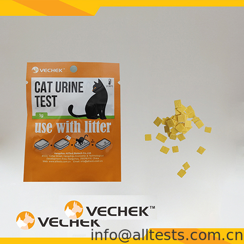 3. 고양이가 배뇨한 후 5분 동안 기다린 후, 고양이 모래의 소변 젖은 부분의 색상 변화를 관찰합니다.