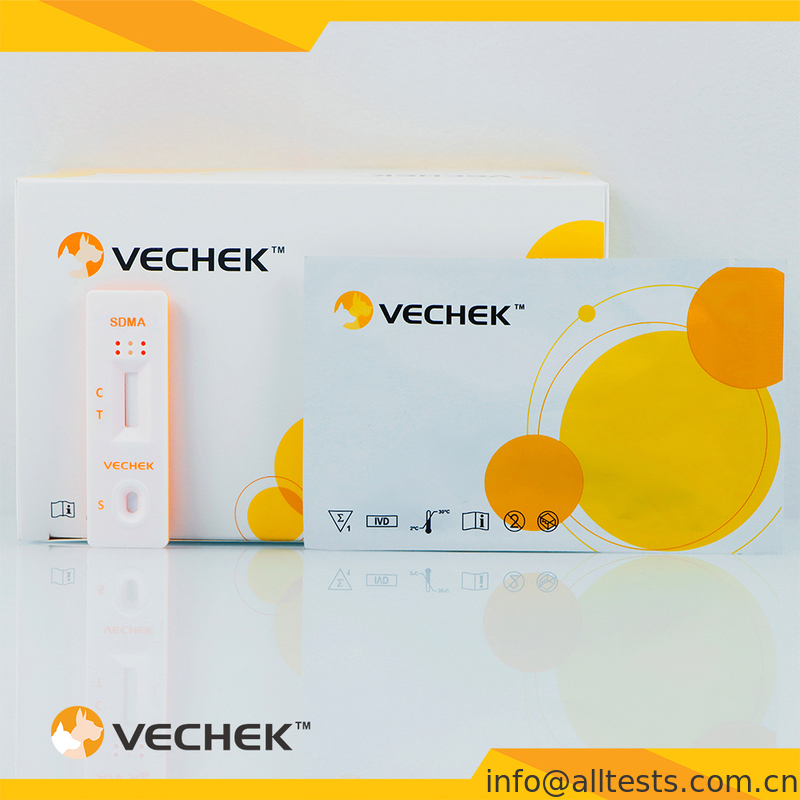 Symmetric Dimethylarginine (SDMA) Rapid Test Cassette (전혈/혈청/혈장)는 개와 고양이의 전혈, 혈청, 혈장에서 SDMA를 반정량적으로 검출하기 위한 측면 흐름 면역크로마토그래피 분석법으로, 컷오프는 14μg/dL입니다. 수의학적 사용 전용입니다.